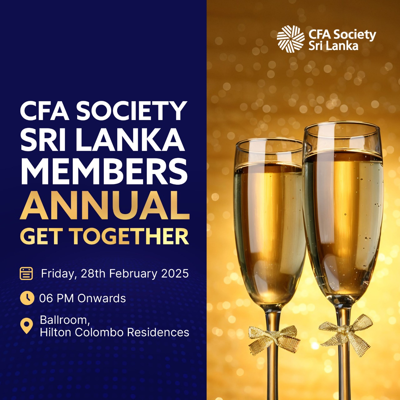 Featured February 28 @ 6:00 pm - 11:30 pm CFA Society Sri Lanka Members Annual Get Together Ballroom, Hilton Colombo Residences
