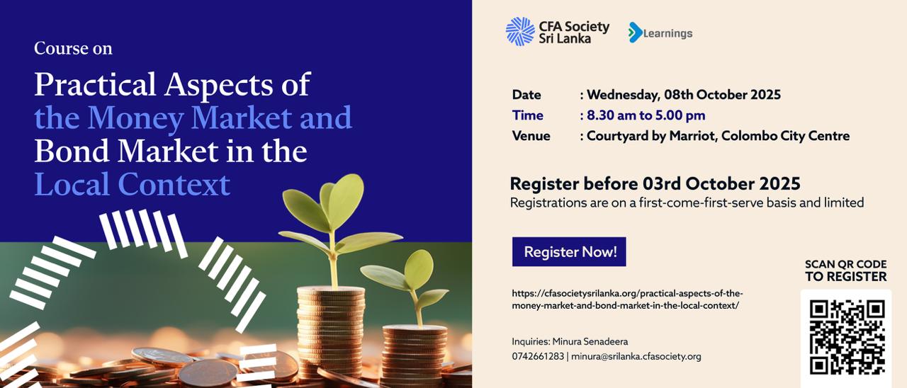 Featured February 20 @ 8:30 am - 5:00 pm Navigating Financial Markets: A Practical Approach to Money, Foreign Exchange and Bond Markets with Local Insights GF2 Hall, Galle Face Hotel, Colombo 03